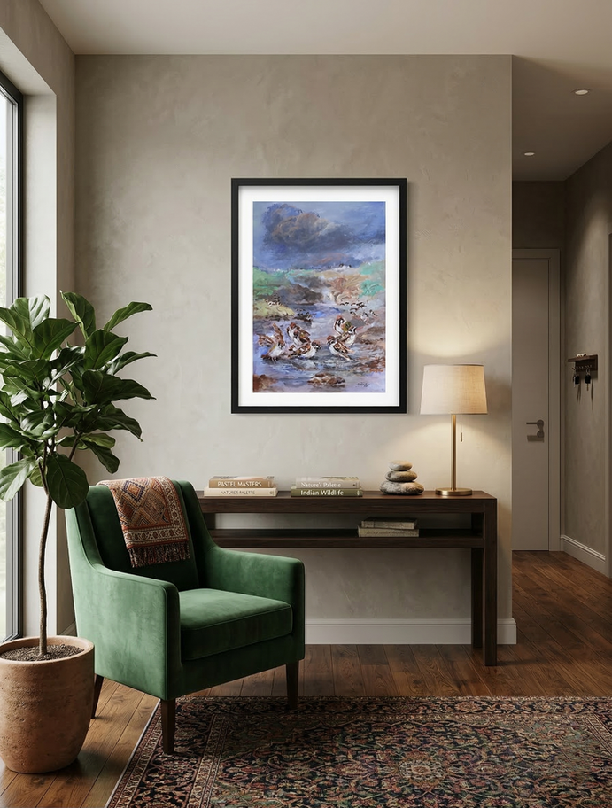 This vibrant watercolor on paper captures a lively moment in nature, where a flock of sparrows gathers and plays along the edge of a gently flowing stream. The composition beautifully balances movement and atmosphere, with expressive brushstrokes bringing the birds to life as they flutter, bathe, and interact with their surroundings. A dramatic, cloud-filled sky looms above, rendered in rich blues and soft greys, contrasting with the warm earthy tones and fresh greens of the landscape below. The artist’s fluid technique and layered washes create a sense of depth and spontaneity, while delicate splashes of paint evoke the sparkle of water and the energy of the scene. This piece offers a joyful yet tranquil glimpse into everyday nature, making it a charming addition for collectors who appreciate expressive wildlife and atmospheric landscapes.