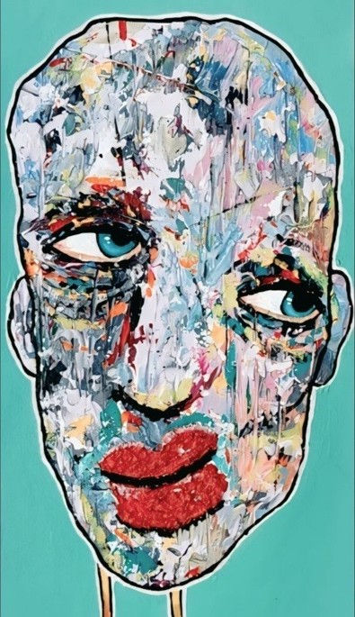 This painting shows a human face in an abstract style. The face is filled with colourful splashes and irregular shapes, symbolizing complex human emotions and inner feelings. The different colours represent happiness, sadness, anger, confusion, and inner conflict. The distorted form and simple background suggests how people hide their real emotions behind a mask in society. Overall, the painting expresses the concept that human feelings are often concealed behind visible face or social mask.