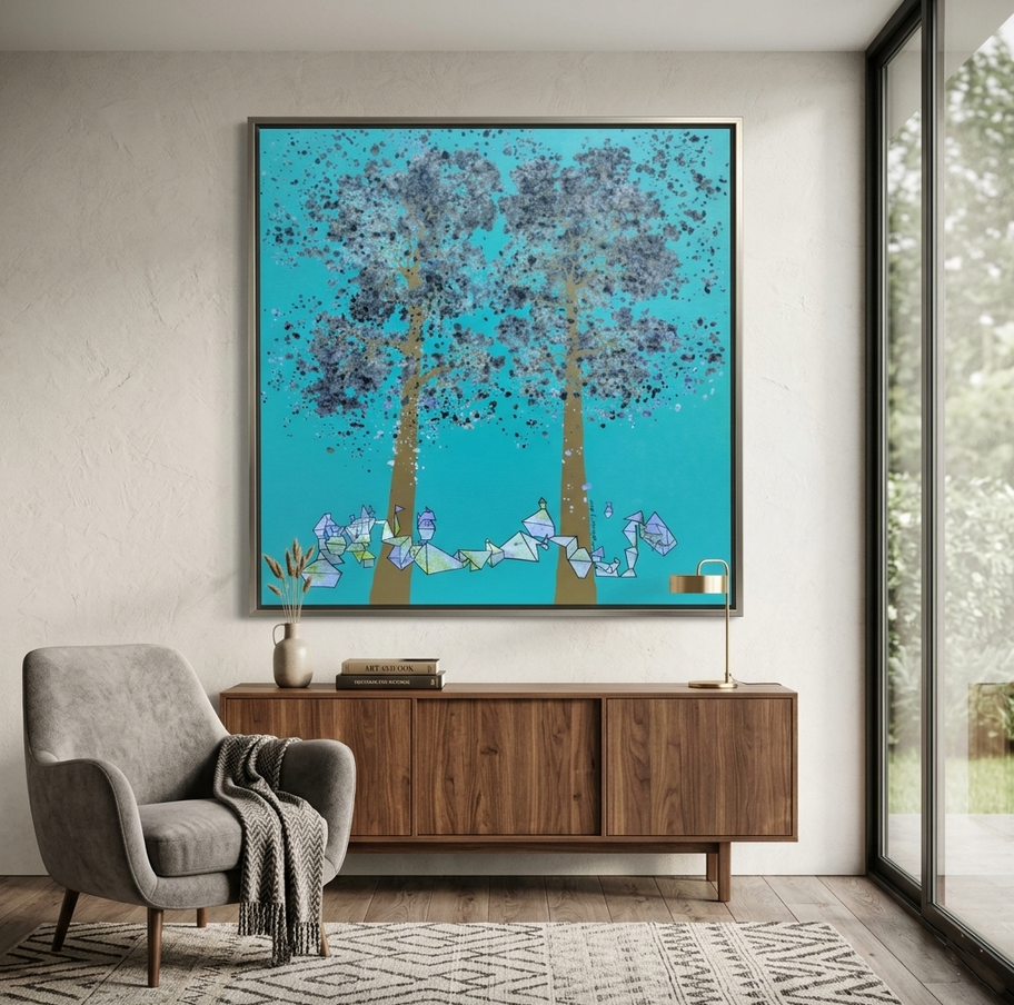 This acrylic-on-canvas artwork captures a contemporary, dreamlike interpretation of nature, where two stylized trees rise against a vibrant turquoise backdrop, their delicate, branching forms crowned with textured, speckled foliage in cool, muted tones. Beneath them, a band of geometric, fragmented shapes introduces a striking contrast, suggesting reflections, figures, or an abstract landscape, blending structure with organic flow. The interplay between the soft, atmospheric canopy and the crisp, angular elements below creates a sense of balance between chaos and order, imagination and reality. Both calming and visually intriguing, this piece invites personal interpretation while adding a modern, artistic statement to any space.