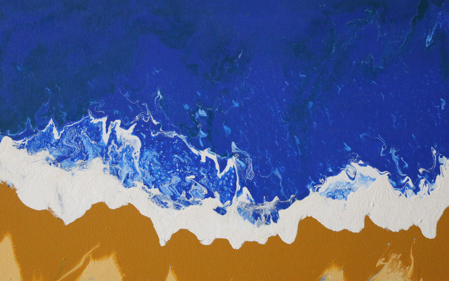 “Sanded” is a bold acrylic painting on canvas that captures the meeting of deep blue sea and warm golden sand in a single, sweeping view. Fluid, foamy white waves crash along the shoreline, created with rich, textured paint that suggests constant motion. The strong color contrast and abstract simplicity make this artwork a striking, modern statement piece for any space.
