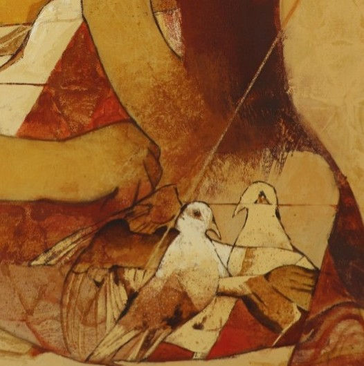 This contemporary acrylic-on-canvas artwork portrays a contemplative human figure through softly abstracted forms and layered textures. A warm palette of ochre, gold, rust, and earthy reds creates a gentle, meditative atmosphere, while subtle geometric lines add structure and balance to the composition. The figure’s inward posture and the presence of delicate bird motifs suggest themes of introspection, care, and quiet connection. Rich in surface detail and emotional nuance, this piece offers a serene yet expressive presence, making it a refined statement artwork for modern interiors and curated art collections.