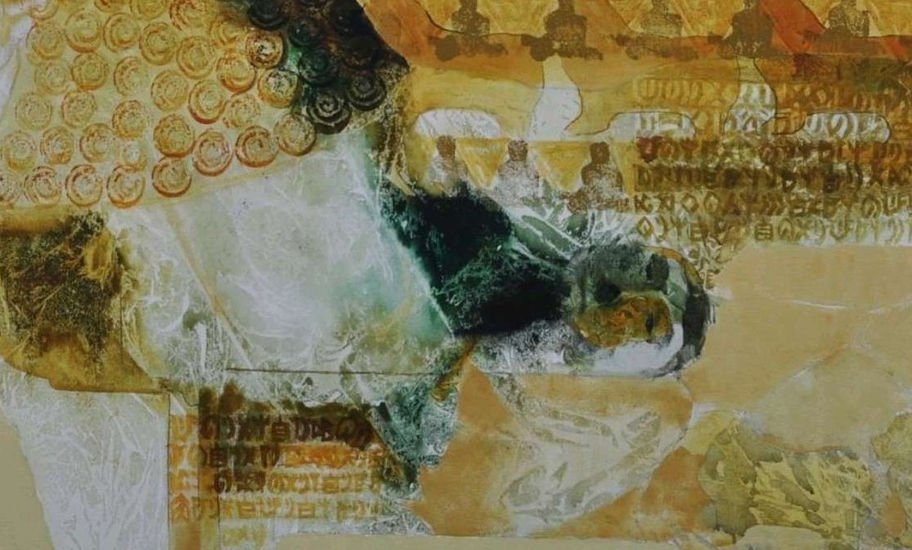 This contemporary acrylic-on-canvas artwork features a reclining human figure rendered through layered textures, repeating motifs, and translucent forms. Warm tones of gold, ochre, and soft beige are balanced with deeper green accents, creating a harmonious and meditative palette. Spiral patterns and repeated figurative elements in the background evoke themes of introspection, collective consciousness, and inner calm. The abstracted form and rich surface detailing invite quiet reflection, making this piece a serene yet compelling statement artwork for modern interiors and curated art collections.