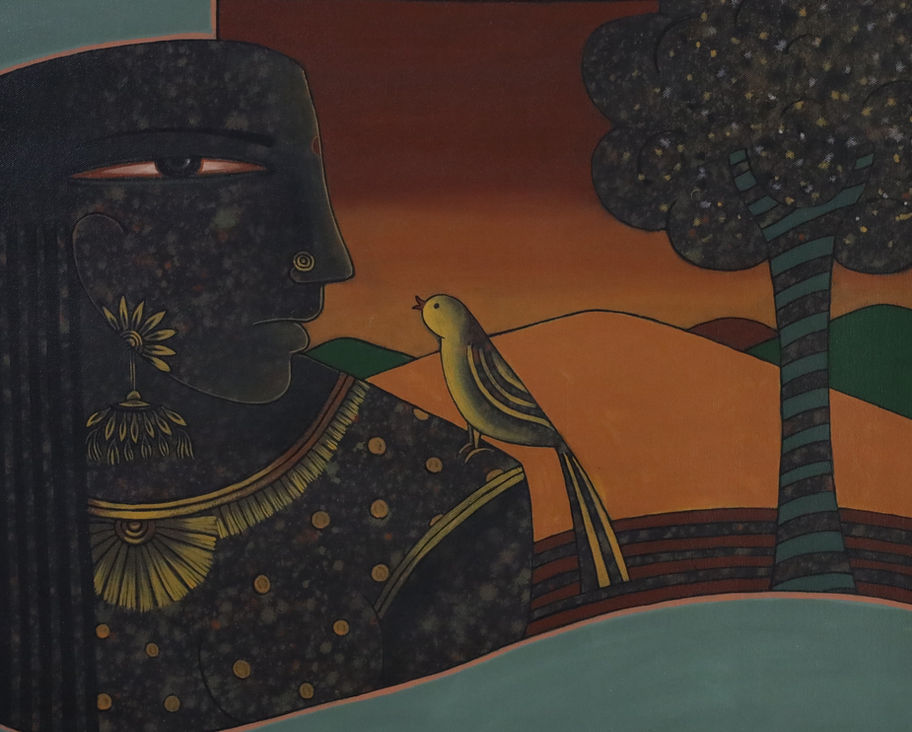 This poetic mixed media on canvas artwork features a majestic black female figure adorned with intricate gold jewelry, tenderly holding a vibrant yellow bird near her lips, set against a dramatic sunset landscape with a starry tree and rolling green hills on a teal horizon. The composition blends regal abstraction with natural serenity, evoking harmony between humanity and the wild through rich textures and luminous contrasts. A stunning acquisition for collectors drawn to evocative, modern Indian narratives of grace and connection.
